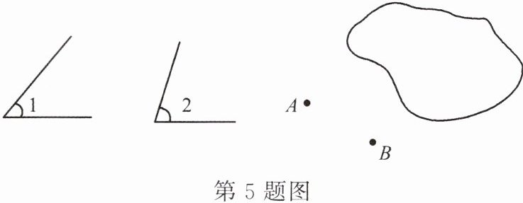 5. 小亮的一张地图上有$A$,$B$,$C$三个城市,但地图上的$C$城市被墨迹污染了(如图),但知道$∠BAC = ∠1$,$∠ABC = ∠2$,请你用尺规作图的方法帮他在图中确定城市$C$的具体位置(用尺规作图,保留作图痕迹,不写作法)。
