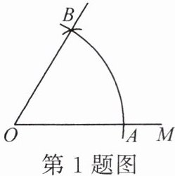1. 如图,已知射线$OM$,以$O$为圆心,任意长为半径作弧,与射线$OM交于点A$,再以点$A$为圆心,$AO$长为半径作弧,两弧交于点$B$,作射线$OB$,那么$∠AOB$的度数是( )。