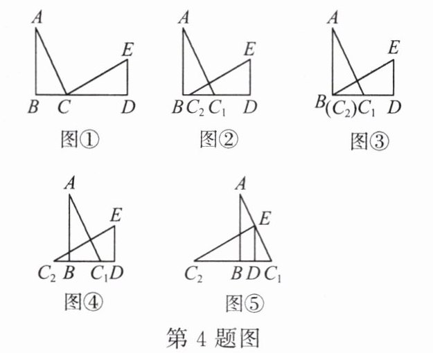 4. 如图①,由已知$AB\perp BD$,$ED\perp BD$,$AB = CD$,$BC = DE可证得AC\perp CE$,若将$\triangle ECD沿CB$方向平移到图②③④⑤的情形,其余条件不变,则这四种情况下,结论$AC_1\perp C_2E$仍然成立的有( )。