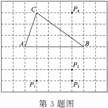 3. 如图,在方格纸中,以$AB为一边作\triangle ABP$,使之与$\triangle ABC$全等,从$P_1$,$P_2$,$P_3$,$P_4四个点中找出符合条件的点P$,则点$P$有( )。