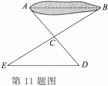 11. (13分)如图,有一池塘,要测量池塘两端 $ A $,$ B $ 的距离,可先在平地上取一个点 $ C $,从点 $ C $ 不经过池塘可以直接到达点 $ A $ 和 $ B $。连接 $ AC $ 并延长到点 $ D $,使 $ CD = CA $。连接 $ BC $ 并延长到点 $ E $,使 $ CE = CB $。连接 $ DE $,那么量出 $ DE $ 的长就是 $ A $,$ B $ 的距离。为什么?
