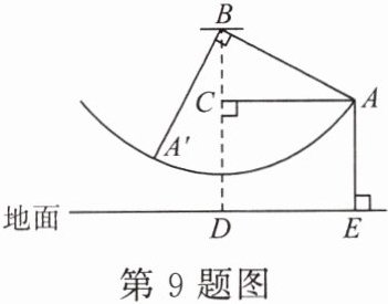 9. 如图是小朋友荡秋千的侧面示意图,静止时秋千位于铅垂线 $ BD $ 上,转轴 $ B $ 到地面的距离 $ BD = 2.5 m $。小乐在荡秋千过程中,当秋千摆动到最高点 $ A $ 时,测得点 $ A $ 到 $ BD $ 的距离 $ AC = 1.5 m $,点 $ A $ 到地面的距离 $ AE = 1.5 m $,当他从 $ A $ 处摆动到 $ A' $ 处时,若 $ A'B \perp AB $,$ A' $ 到 $ BD $ 的距离是______。