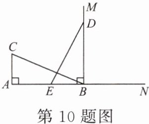 10. 如图,$ CA \perp AB $,垂足为 $ A $,$ AB = 8 $,$ AC = 4 $,射线 $ BM \perp AB $,垂足为 $ B $,一动点 $ E $ 从 $ A $ 点出发以 2 每秒的速度沿射线 $ AN $ 运动,点 $ D $ 为射线 $ BM $ 上一动点,随着 $ E $ 点运动而运动,且始终保持 $ ED = CB $,当点 $ E $ 运动______秒时,$ \triangle DEB $ 与 $ \triangle BCA $ 全等。
