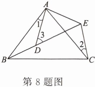 8. 如图,$ AB = AC $,$ AD = AE $,$ \angle BAC = \angle DAE $,$ \angle 1 = 22° $,$ \angle 2 = 34° $,则 $ \angle 3 = $______。