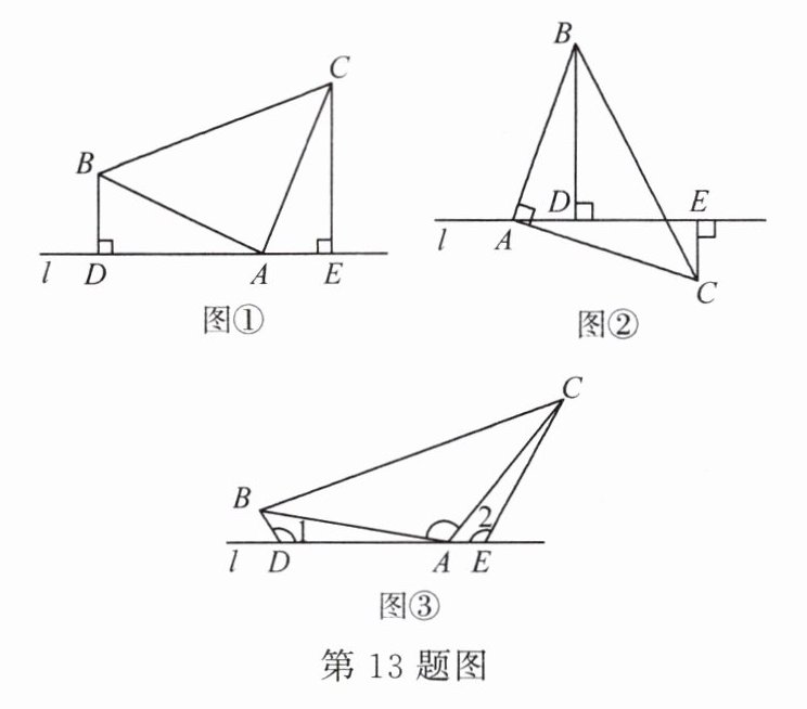 13. (14分)(1)模型的发现:如图①,在 $ \triangle ABC $ 中,$ \angle BAC = 90° $,$ AB = AC $,直线 $ l $ 经过点 $ A $,且 $ B $,$ C $ 两点在直线 $ l $ 的同侧,$ BD \perp l $,$ CE \perp l $,垂足分别为 $ D $,$ E $。