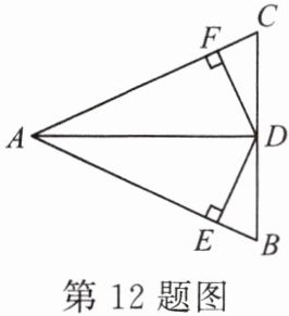 12. (13分)如图所示,$ AD $ 是 $ \triangle ABC $ 的中线,$ DF \perp AC $,$ DE \perp AB $,垂足分别为 $ F $,$ E $,$ BE = CF $。
