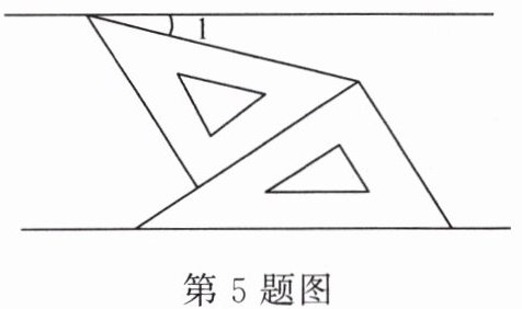5. 如图,将一副三角板和一张对边平行的纸条按下列方式摆放,两个三角板的一直角边重合,含 $ 30° $ 角的直角三角板的斜边与纸条一边重合,含 $ 45° $ 角的三角板的一个顶点在纸条的另一边上,则 $ \angle 1 $ 的度数为____。