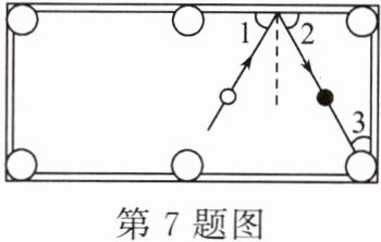 7. 如图,$\angle 3 = 30^{\circ}$,为了使白球反弹后能将黑球直接撞入袋中,那么击打白球时,必须保证$\angle 1$的度数为( )。