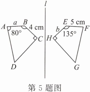 5. 如图,两个四边形关于直线$l$成轴对称,$\angle C = 90^{\circ}$,试写出$a$,$b$的长度,并求出$\angle G$的度数。