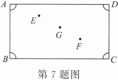 7. 台球是一项流行的体育活动。如图是一张台球桌,目标球 F 与本球 E 之间有一个 G 球阻挡。击球者想通过击打 E 球,使 E 球先撞击球台的 AD 边,经过一次反弹后再撞击 F 球。他应将 E 球击到 AD 边上的哪一个点? 请画出 E 球的运行路线。