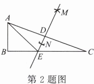 2. 如图,在 $ Rt \triangle ABC $ 中,$ \angle B = 90° $,$ \angle C = 20° $,分别以点 $ A $,$ C $ 为圆心,大于 $ \frac{1}{2}AC $ 的长为半径作弧,两弧相交于点 $ M $,$ N $,作直线 $ MN $,分别交 $ AC $,$ BC $ 于点 $ D $,$ E $,连接 $ AE $。则 $ \angle BAE = ( ) $。