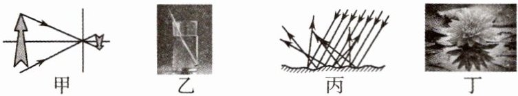 D. 图丁中,荷花在水中形成倒影是由光的直线传播形成的