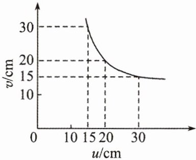 B.当物距 $ u = 30 cm $ 时,像距 $ v = 15 cm $