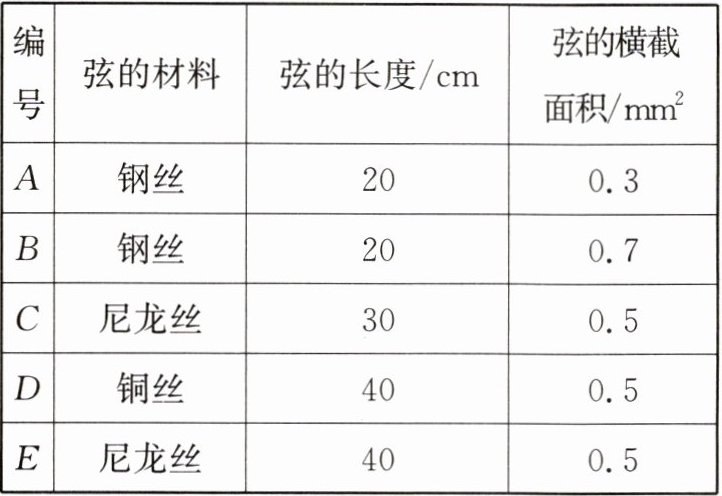 |编号|弦的材料|弦的长度/cm|弦的横截面积$/mm^2$|