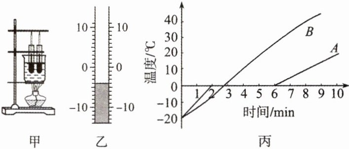 4. 在“探究物质熔化规律”的实验中,某同学将质量相等的冰和石蜡分别装在两个相同的试管中,并放在同一个装有水的大烧杯中进行加热,如图甲所示。根据实验数据绘制的温度随时间变化的图像如图丙所示。请回答下列问题: