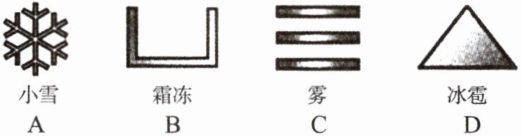 5.下列符号分别代表小雪、霜冻、雾、冰雹四种天气现象,属于液化现象的是(