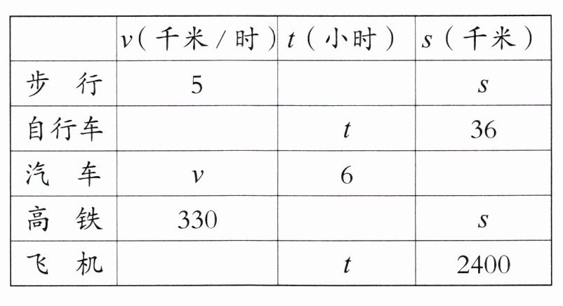 9.如果用s表示路程、t表示时间、v表示速度,那么请用含有字母的式子填写下表。