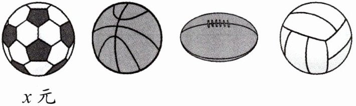 则一个篮球的价格为$(x + 8)$元,一个橄榄球的价格为$(x−4)$元,一个排球的价格为$2x$元。