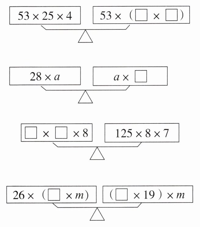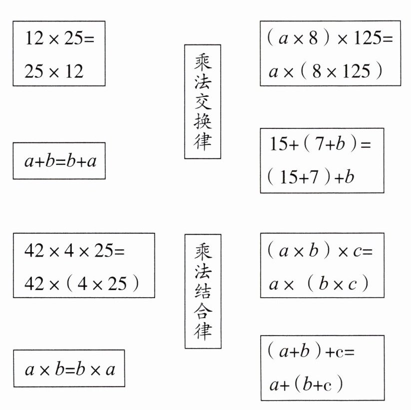$12×25 = 25×12$、$a× b = b× a$连乘法交换律;$42×4×25 = 42×(4×25)$、$(a×8)×125=a×(8×125)$、$(a× b)× c=a×(b× c)$连乘法结合律。
