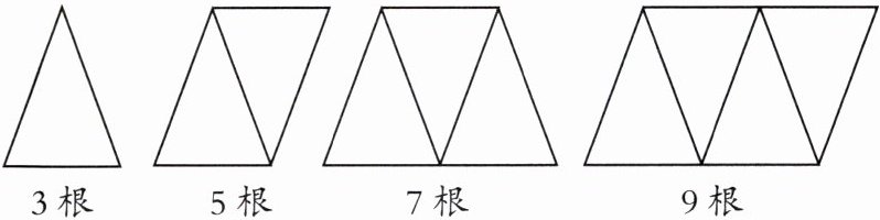 摆1个三角形要用3根小棒,摆2个三角形要用5根小棒,摆3个三角形要用7根小棒,摆4个三角形要用9根小棒。