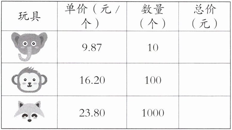 |玩具|单价(元/个)|数量(个)|总价(元)|