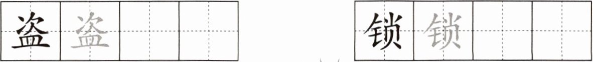 锁锁 左面“钅”字旁,右面“𤔔”(右部分结构)书写—— 第一笔撇(右部分起笔),后面的笔画按规范在田字格中书写,左窄右宽,撇要舒展;在田字格中注意各部分占格位置。 (实际是在田字格中按正确笔顺和结构书写这两个字各两遍)