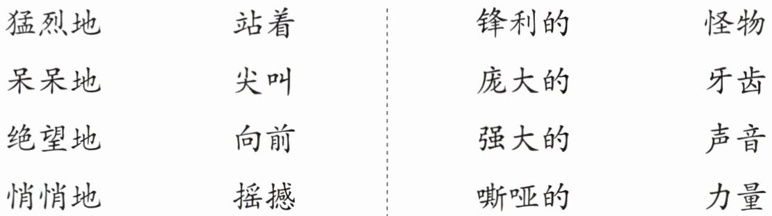 2.示例:(1)一只 呆呆 无可奈何 (2)猛烈 路旁 3.示例:我的手不停地颤抖,额头上满是汗水。