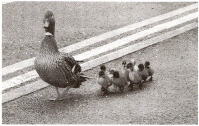 示例:鸭妈妈走在最前方,用自己的身躯掩护着挤作一团的小鸭子们。它警觉地伸长脖颈张望,发出嘎嘎的叫声。突然,疾驰的车辆呼啸而过,小鸭子们有的被吓得摔倒在地,有的在原地僵住,有的慌乱地叫着。鸭妈妈只得张着翅膀折返,一边发出一声声低沉短促的呼唤,一边将迷途的小鸭子拱回队列。在它眼中,来往的车辆是多么庞大的怪物啊!可是它不能退缩,它要带领自己的孩子们穿过这条危险重重的道路,抵达那片闪着波光的池塘。原来最伟大的跋涉,有时不过是从马路这边到马路那边。