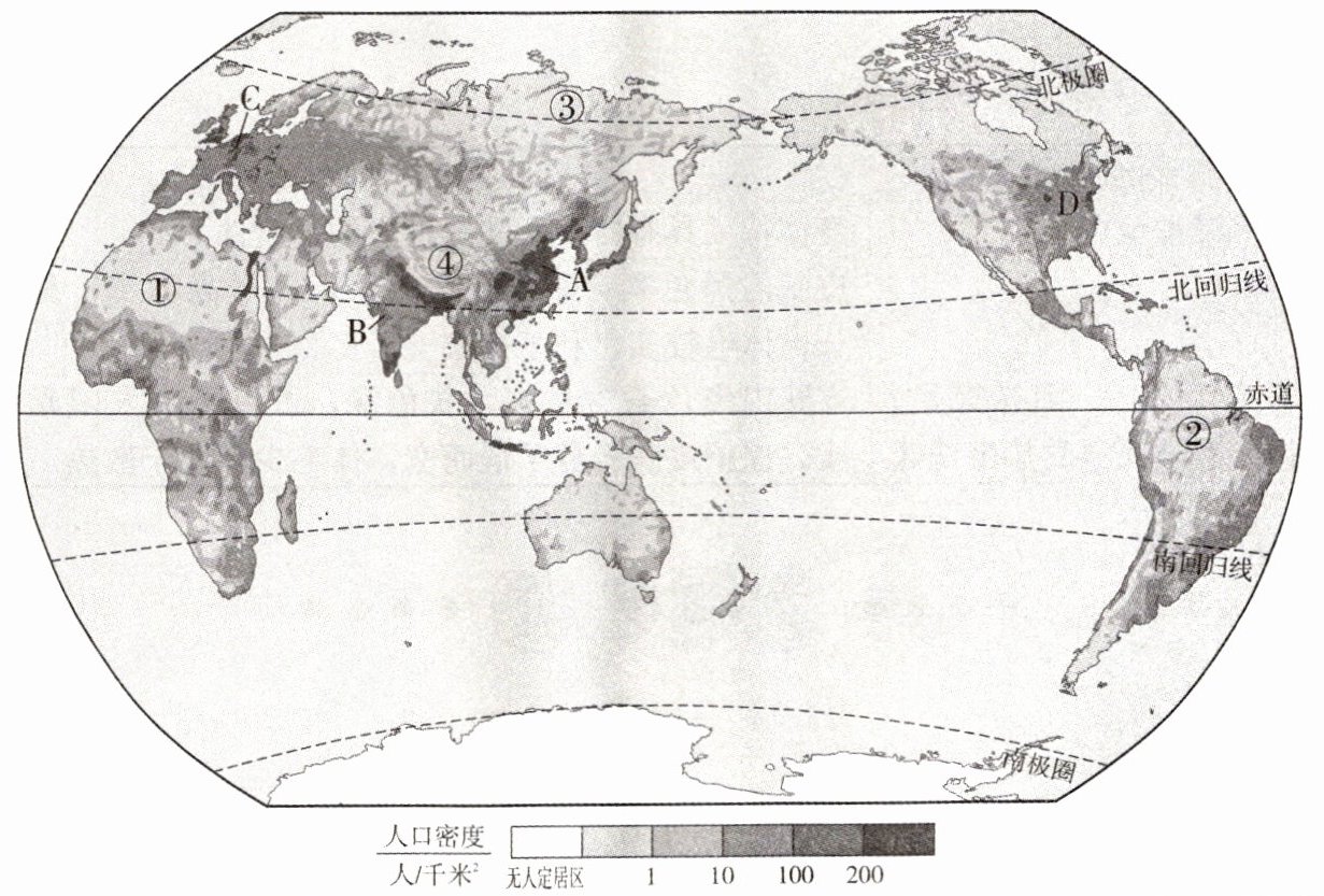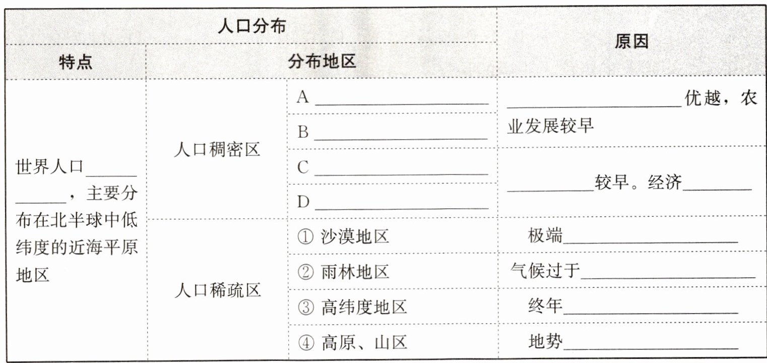 (1)自然因素。气候适宜、土壤肥沃、资源丰富、地形平坦等自然条件优越的地区人口稠密,反之则人口稀疏。
