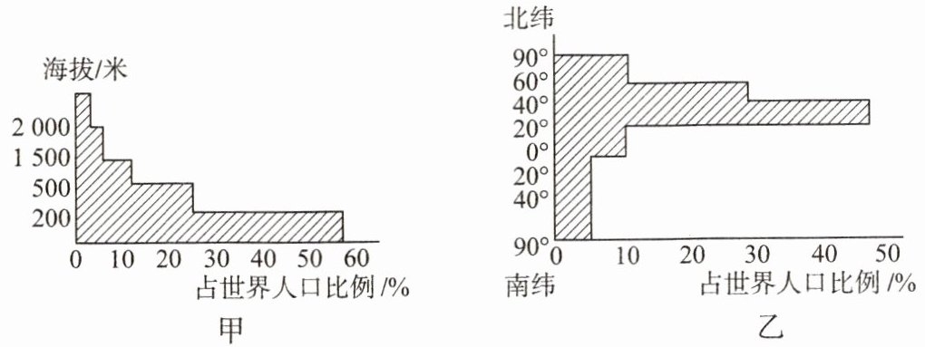 7. 据甲图分析,从地形类型看,世界约有 56%的人口分布在(