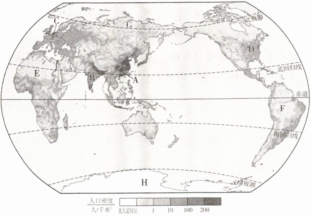 (1)写出世界人口分布稠密区。