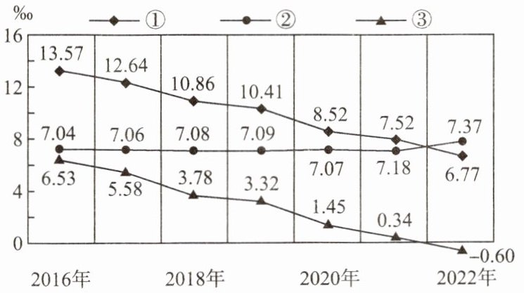16. 人口自然增长率等于人口出生率减人口死亡率。下图为 2016−2022 年我国人口出生率、人口死亡率和人口自然增长率变化图(不包括港、澳、台数据)。读图,回答下列问题。