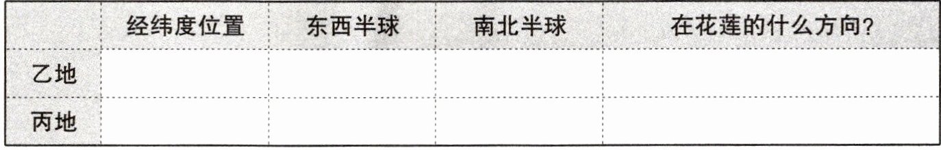 | 经纬度位置 | 东西半球 | 南北半球 | 在花莲的什么方向? |
