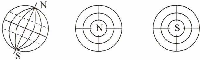 2. 拨动地球仪,从不同角度观察地球自转的方向。请在右侧的地球侧视图、以北极为中心的俯视图、以南极为中心的俯视图上用箭头表示地球自转方向。