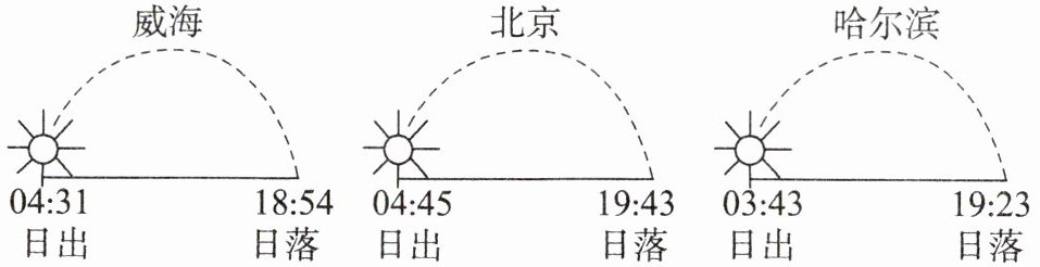 5. 山东威海某中学小明同学用智能手机查找某日威海、北京、哈尔滨三个城市的日出日落时间,截图如下。下列说法正确的是(