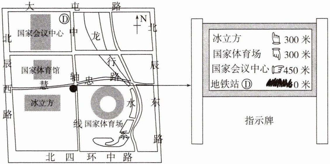 13. 小明在国家体育场观看完开幕式后,想去观看花样滑冰比赛。他的行进方向为(