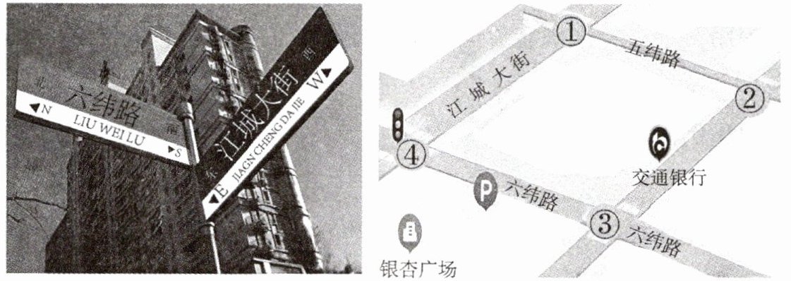 19. 道路指示牌是我们生活中常见的指路工具。下图中,图左是小明所在的某地一十字路口道路指示牌,图右是此地部分街道简图。小明所在的位置是(
