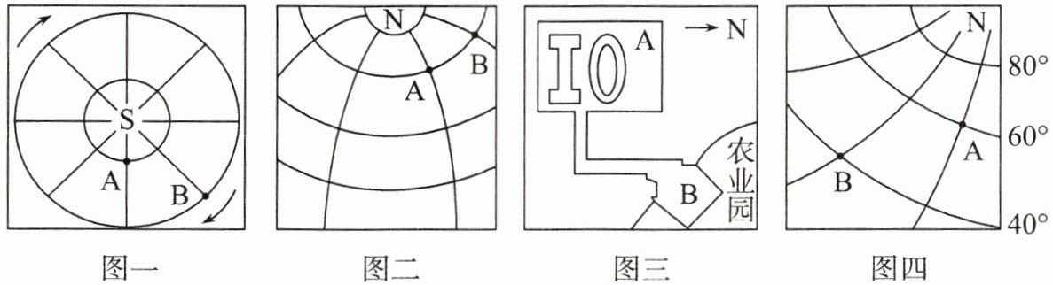 21. 图一中,A 位于 B 的东南方向。图二中,B 位于 A 的正东方向。图三中,B 位于 A 的东北方向。图四中,B 位于 A 的西南方向。
