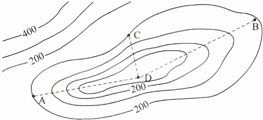 4. 在等高线地形图上,可以判断坡度的陡缓。如下图,AD、BD和CD三处,坡度最陡的是______,坡度最缓的是______,判断依据是_。在爬山时,选择等高线密集的路线比较费力;选择等高线稀疏的路线比较______。