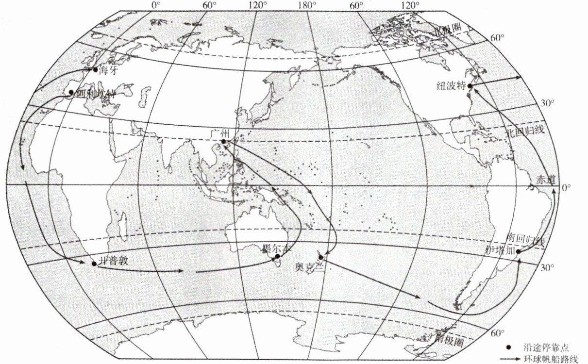 洲的海牙,绕地球一圈。(2)沿途所经过的停靠点大多数位于
