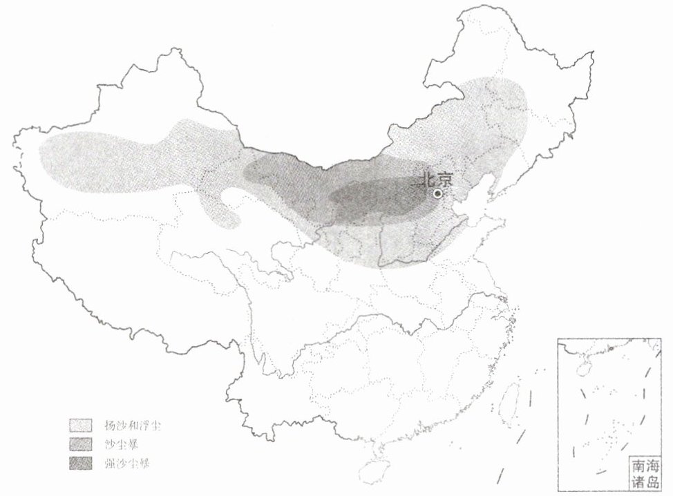 2023 年 3 月 19 日至 23 日发生的强沙尘暴,是 2023 年强度最强、影响范围最广的一次沙尘暴。读全国沙尘天气预报图(3 月 19 日 08 时至 22 日 08 时),完成 11-12 题。