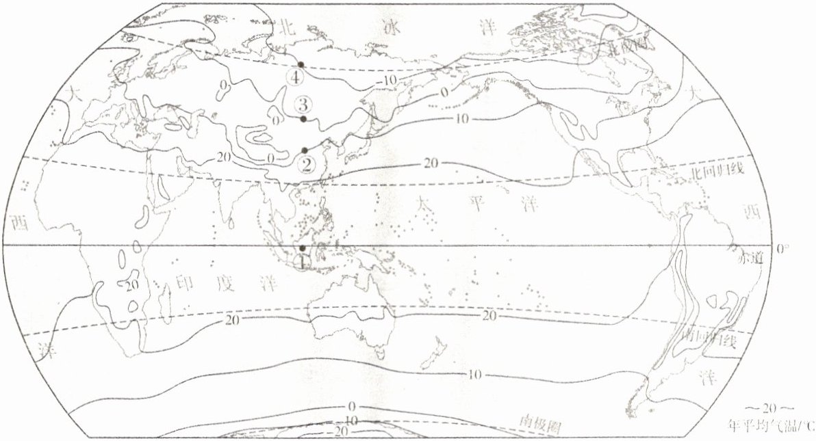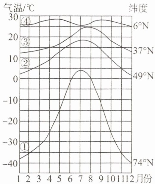下图为四地的气温年变化曲线图,读图完成6-7题。