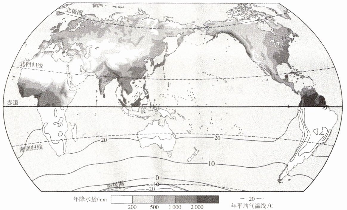 下图为北半球年降水量分布和南半球年平均气温分布的组合图,读图完成10-11题。