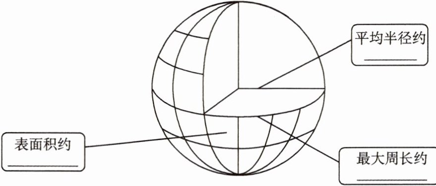 3. 人们利用人造地球卫星精确地测量了地球的大小。请在下图中写出地球表面积、最大周长、平均半径。