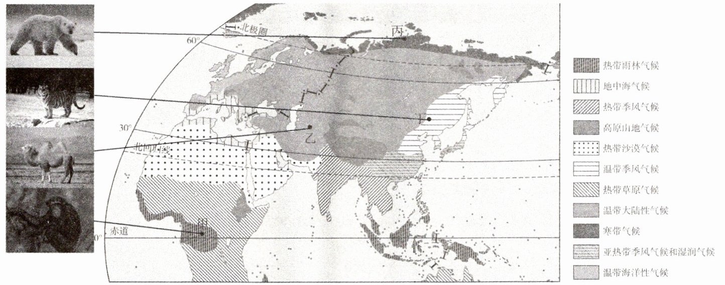 (1)四位新成员中,黑猩猩居住在赤道附近的甲______气候区;骆驼居住的区域是世界分布面积最广的乙______气候区,该区域气候特征是______。