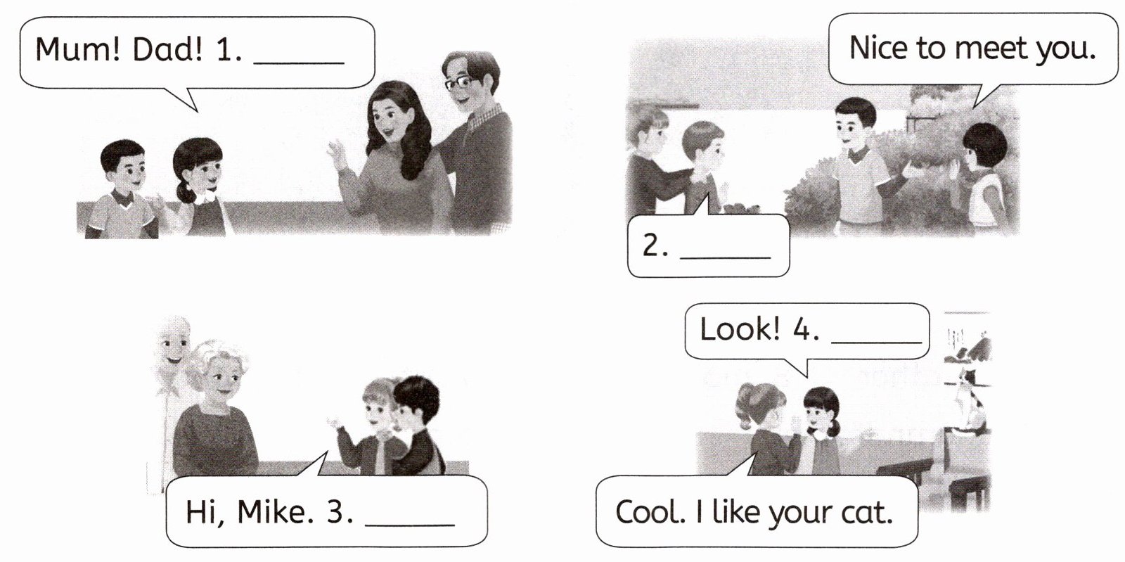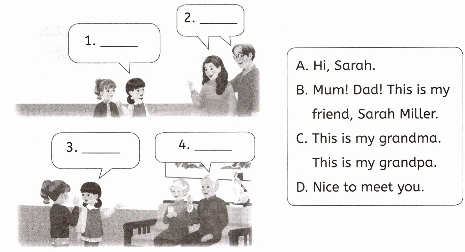 Ⅲ. Read and choose.(陈杰是如何给家人介绍 Sarah 的呢?请读图,从方框中选择合适的句子补全对话,将标号填写在横线上。)
