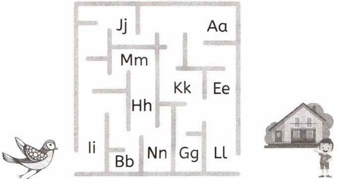 (齐诚在带小鸟回家的路上,教它识记回家的路线。请听录音,把“字母路标”连起来,找到回家的路线。)