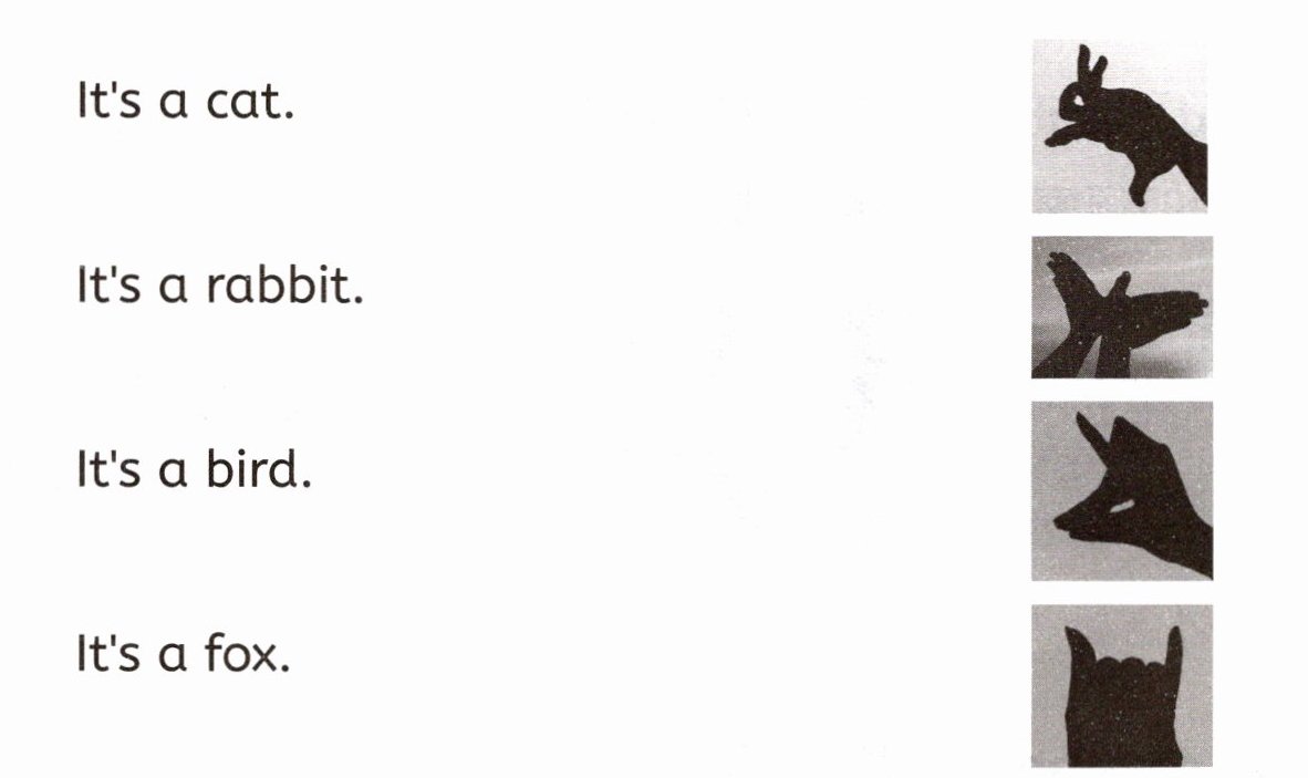 Ⅲ. Read and match.(同学们正在用手影模仿动物。请将句子与其对应的手影连线。)