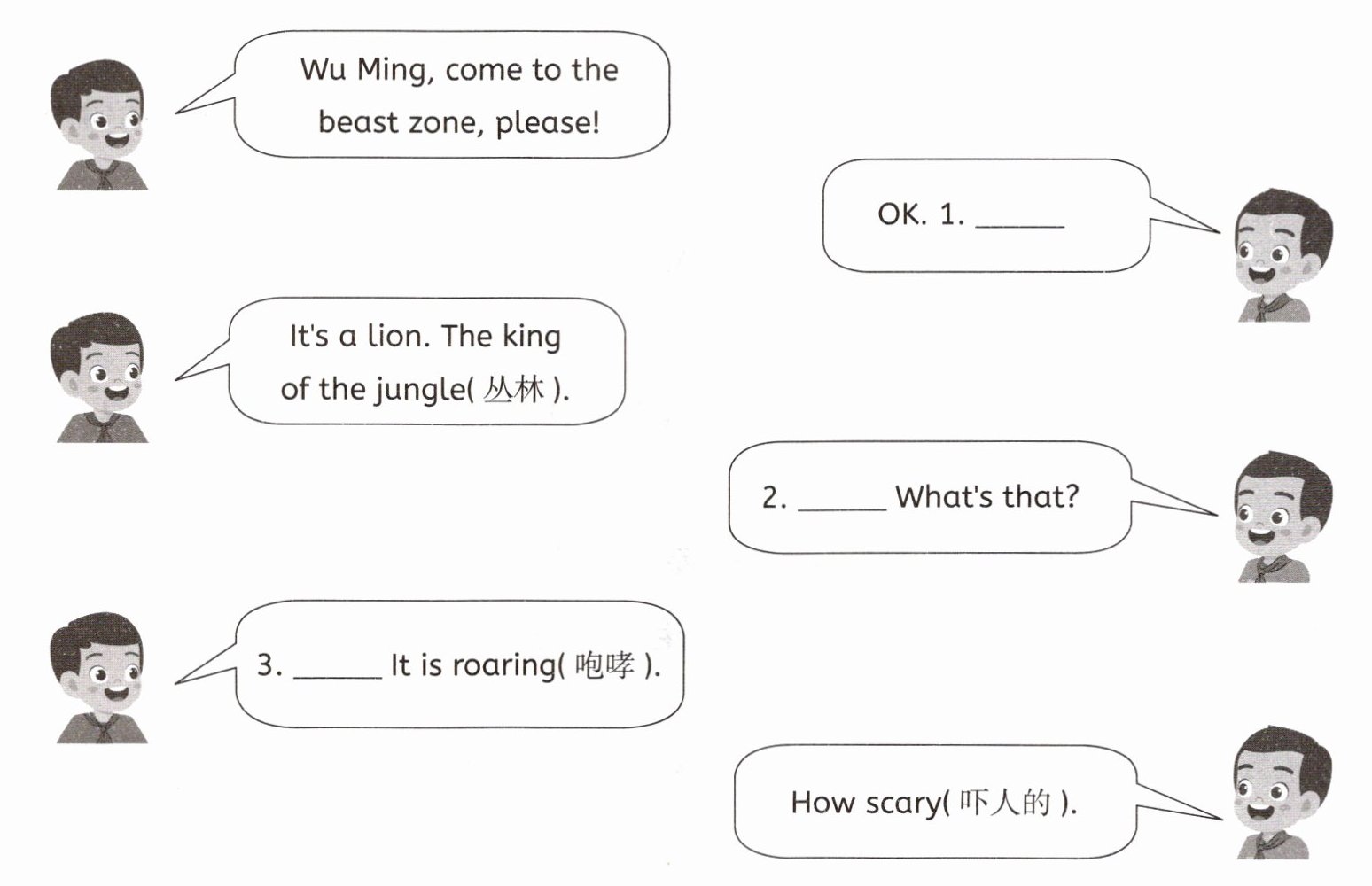 Ⅳ. Read and choose.(齐诚和吴明进入猛兽馆参观。请选择合适的句子,将标号填写在横线上,帮他们补全对话吧。)