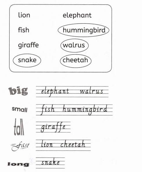 Read and group. (大自然神秘多彩, 创造了令人惊奇的野生动物王国。每种动物都有各自的特点, 这是它们赖以生存的条件。请阅读以下内容, 在方框中圈出文中出现的动物, 并将所有动物单词归类。)